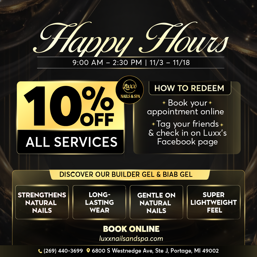 Luxx Nails & Spa is dedicated to taking your nails and spa day to the next level with clean, high-quality products and expert care, and to make your visit even more special, we go above and beyond by Serving Complimentary Soft Drink or Mocktail of Your Choice — all at a reasonable price.